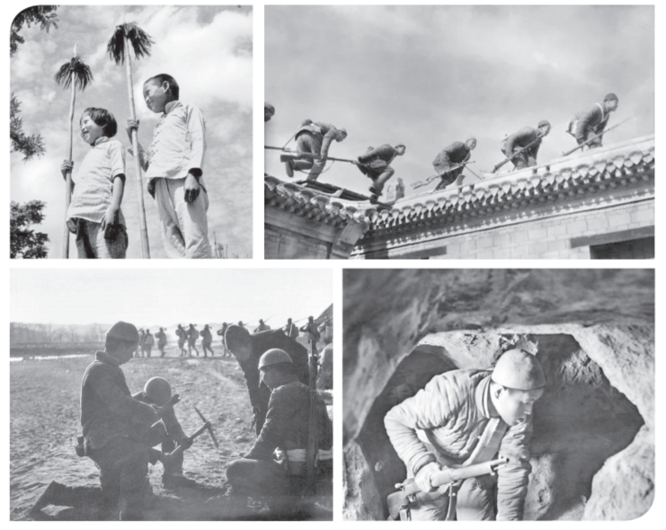 上左:儿童团员。上右:飞檐走壁。下左:埋地雷。下右:地道里战斗