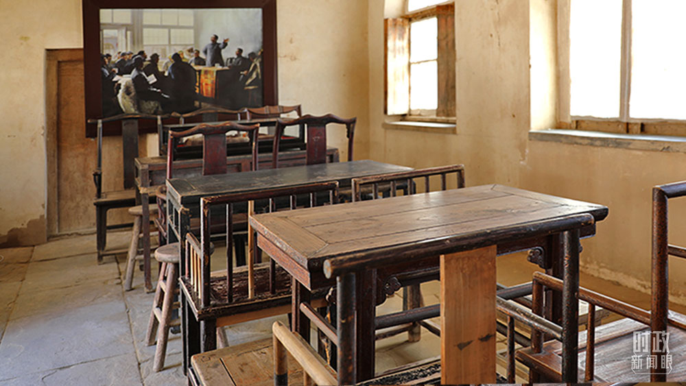 △“十二月会议”场景还原,墙壁上的照片翻拍自画家靳尚谊于1977年创作的布上油画《党的十二月会议》。(总台央广记者刘会民、央视记者许永松拍摄)