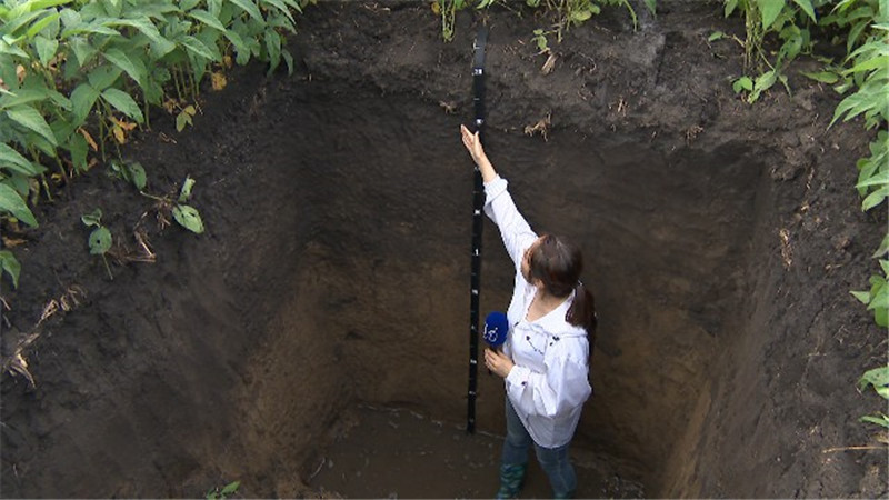 黑龙江广播电视台 李琳 在黑龙江中厚层黑土区的土壤剖面坑里介绍东北黑土地保护情况