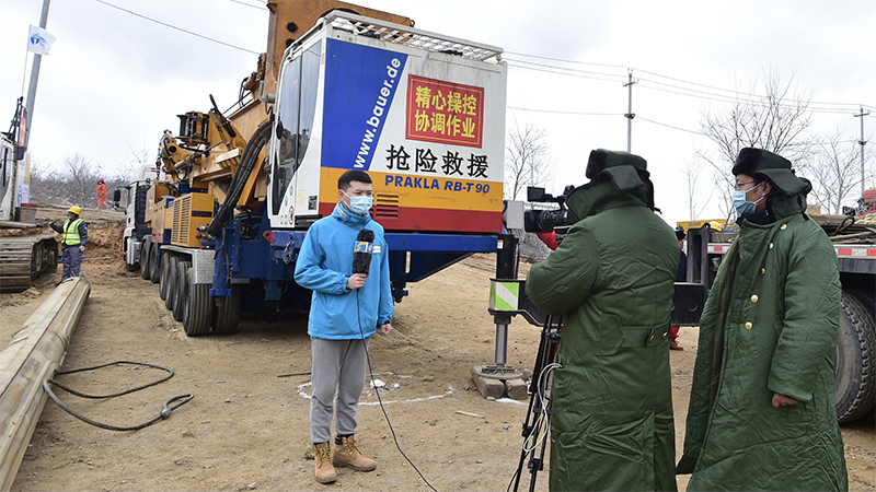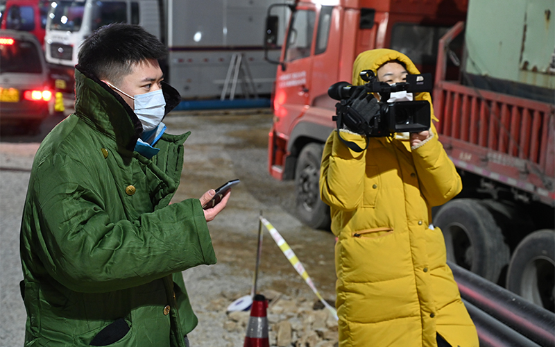 山东广播电视台 史欣亮 记者史欣亮在栖霞笏山金矿事故救援现场报道