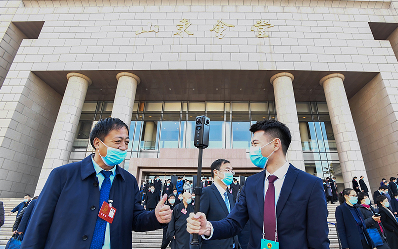 山东广播电视台 史欣亮 记者史欣亮用全景摄像机直播两会