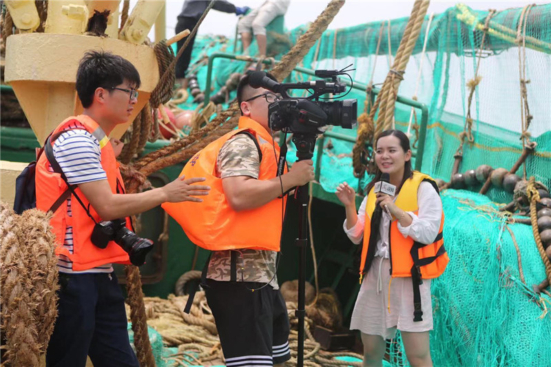 2017年8月22日,浙江日报记者周莎莎在浙江温岭采访开渔节。