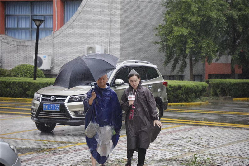 2021年7月26日 ,“烟花”二次登陆平湖,浙江日报记者周莎莎在乍浦高级中学安置点采访。