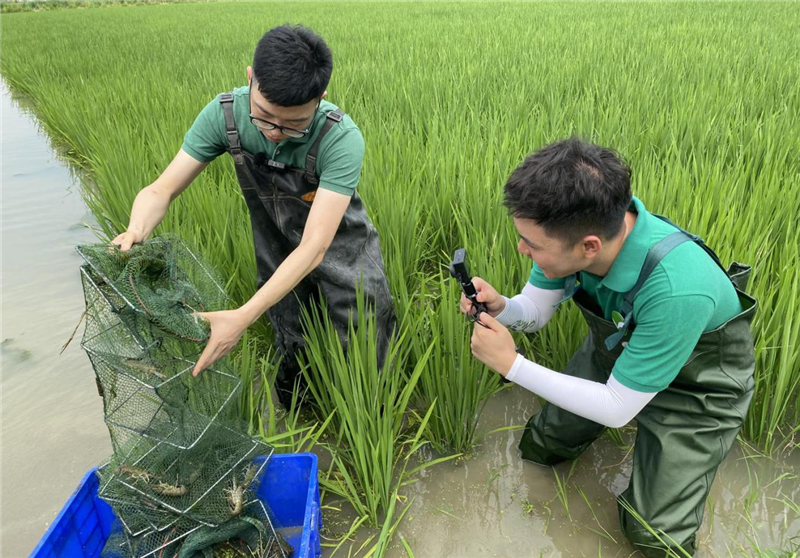 在水稻田里和农技专家边拍边采访,稻田混养小龙虾技术。