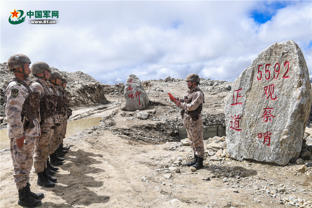 查果拉哨所官兵学习完回信后,面对荣誉旗帜庄严宣誓。王乾 摄