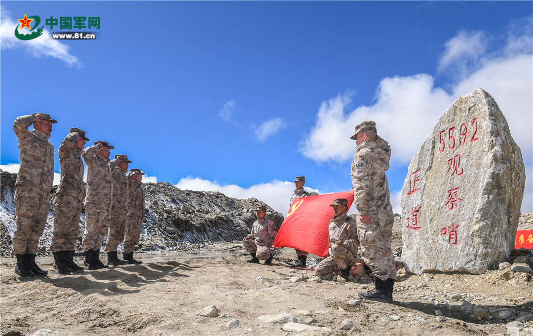 5592观察哨官兵学习完回信后,面对党旗郑重承诺,为祖国站好岗、守好边。陶云波 摄
