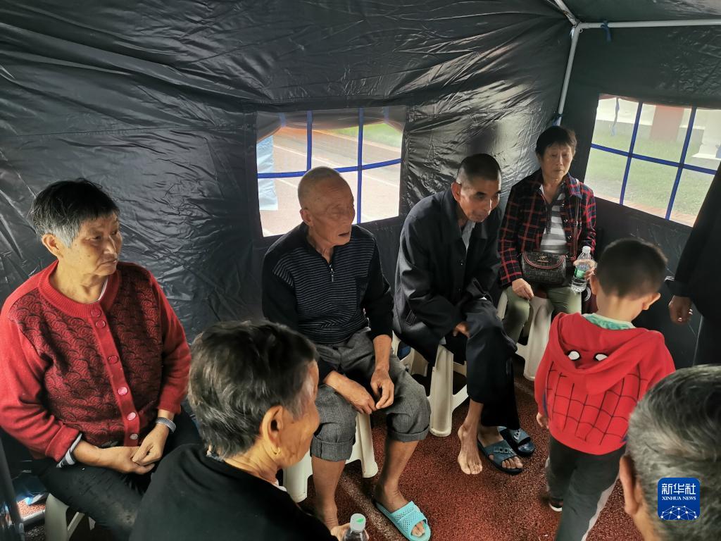 9月16日,在泸县嘉明镇嘉明中心小学临时安置点,受灾群众在搭建起的救灾帐篷里休息。