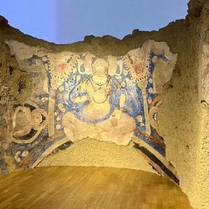 这是9月13日在日本东京艺术大学美术馆拍摄的用“文化遗产克隆技术”做出的阿富汗巴米扬E号窟天井壁画《青弥勒》。新华社记者 郭丹 摄