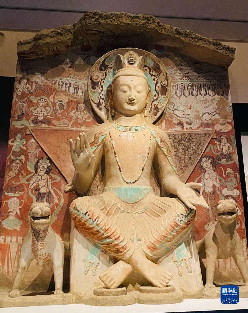 这是9月13日在日本东京艺术大学美术馆拍摄的用“文化遗产克隆技术”做出的、敦煌莫高窟第275窟交脚弥勒菩萨70%比例大小的佛像。新华社记者 郭丹 摄