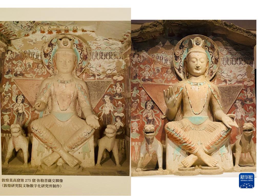 这张拼版照片显示的是,左:敦煌研究院文物数字化研究所提供的敦煌莫高窟第275窟交脚弥勒菩萨照片;右:9月13日在日本东京艺术大学美术馆拍摄的用“文化遗产克隆技术”做出的、敦煌莫高窟第275窟交脚弥勒菩萨70%比例大小的佛像(新华社记者 郭丹 摄)。新华社发