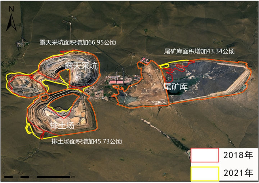 卫星遥感影像显示,2021年该企业仅排土场、尾矿库及露天矿坑等占用草原面积就较2018年增加约156公顷,目前累计违法占用草原面积约1634公顷,对当地草原生态造成严重破坏。