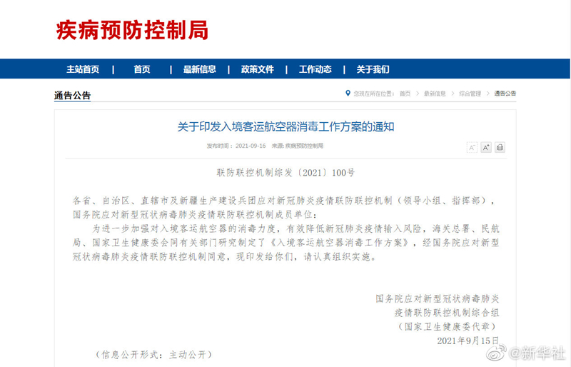 国务院联防联控机制综合组近日印发《入境客运航空器消毒工作方案》。方案明确,入境航空器消毒人员、废弃物清运处置人员,应严格按照国务院联防联控机制《新型冠状病毒肺炎防控方案》中“环境清洁消毒人员”安全防护的要求,从严就高做好个人防护,严格污染控制和规范穿脱防护装备,严防职业暴露风险。同时对这些人员登记造册、集中封闭管理,实施健康管理“一人一档”,核酸检测“一天一检”,疫苗接种“全覆盖”。(记者邱冰清、徐鹏航)