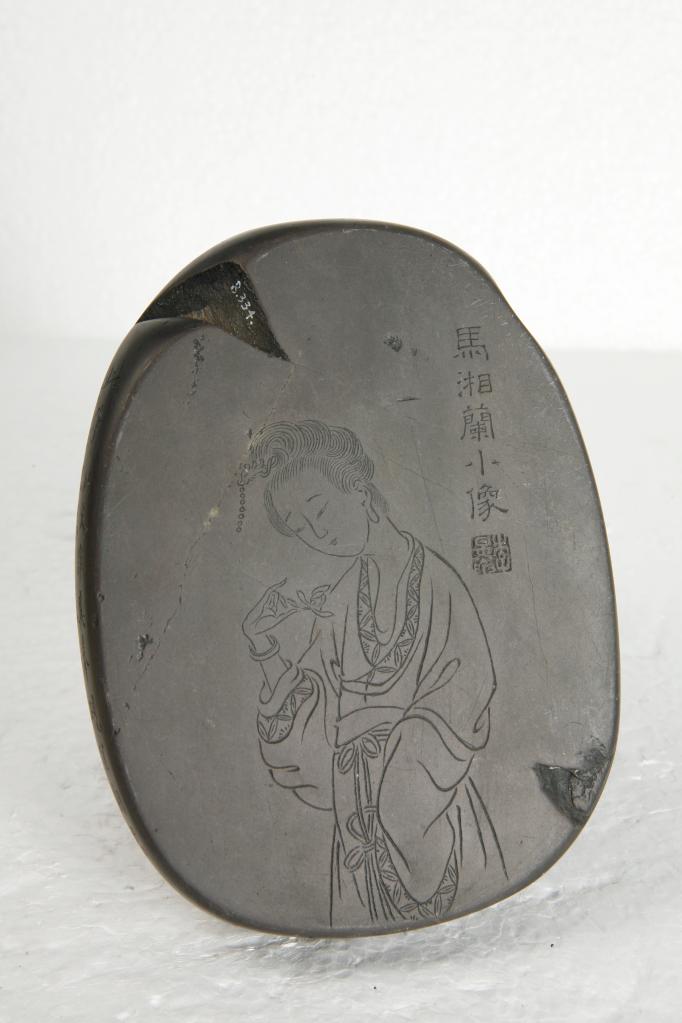 双砚年代不同,材质有异,为何会被徐世章配成一对,共置于一匣之中呢?臧天杰介绍说,其中一方为明代王穉登款澄泥砚,呈长方形,砚面光洁,未加任何雕饰,一侧刻“半偈庵藏研”,另一侧刻有砚铭“半偈庵砚王百毂故物也”,证明此砚应为王穉登旧藏。另一方清代马湘兰小像端砚,呈椭圆形,砚池呈月牙形,砚底阴刻一女性图像,题名“马湘兰小像”五字。这方砚或许是当时为纪念马湘兰或秦淮八艳专门制作而成的。