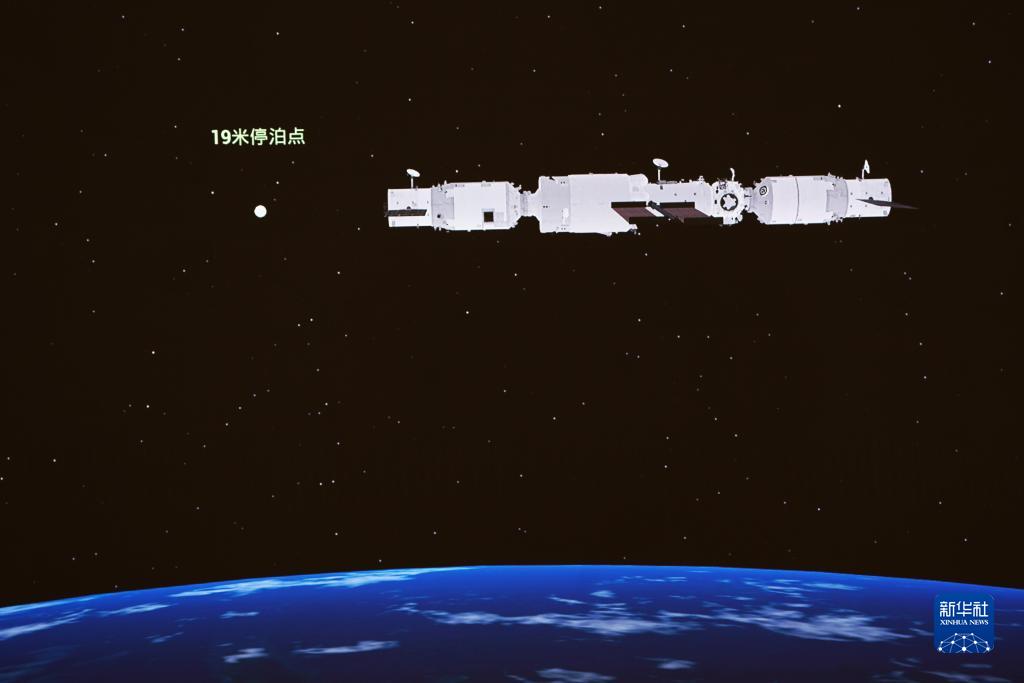 9月20日在北京航天飞行控制中心大屏拍摄的天舟三号货运飞船与在轨运行的空间站组合体交会对接。新华社发(郭中正 摄)