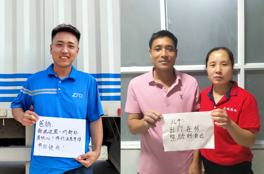 在义乌工作的快递小哥侯加乐(左)无法与父母共度中秋,相互隔空留下叮嘱。受访者供图