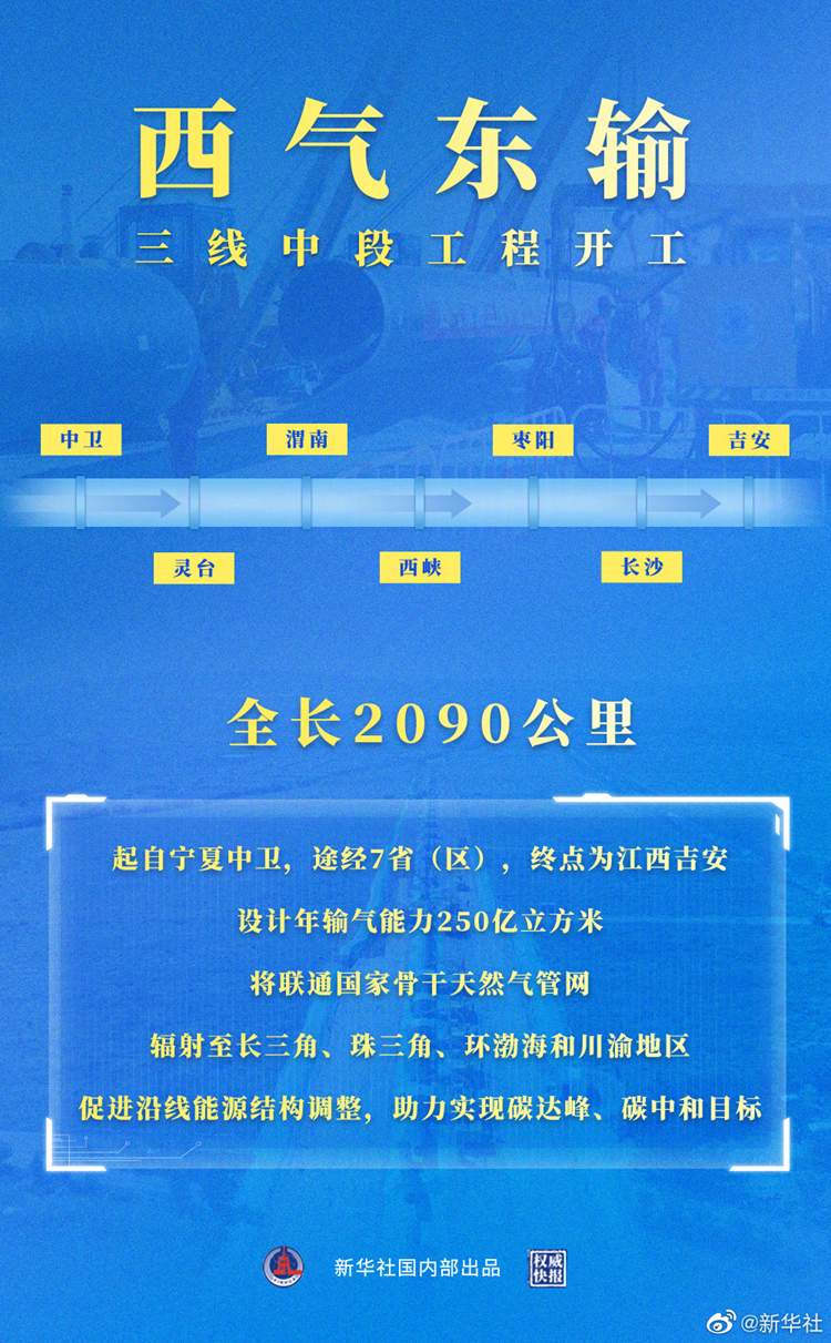 23日,西气东输三线中段(中卫-吉安)工程在宁夏中卫正式开工建设。工程全长2090公里,起自宁夏中卫,途经宁夏、甘肃、陕西、河南、湖北、湖南、江西7省(区),终点为江西吉安。可在现有基础上,提高西气东输管道系统年输气量250亿立方米,与用煤相比,每年可减少二氧化碳排放量7089万吨,对保障沿线地区清洁能源供应,促进当地能源结构调整,助力实现碳达峰、碳中和目标具有重要作用。(记者戴小河,海报设计张晨光)