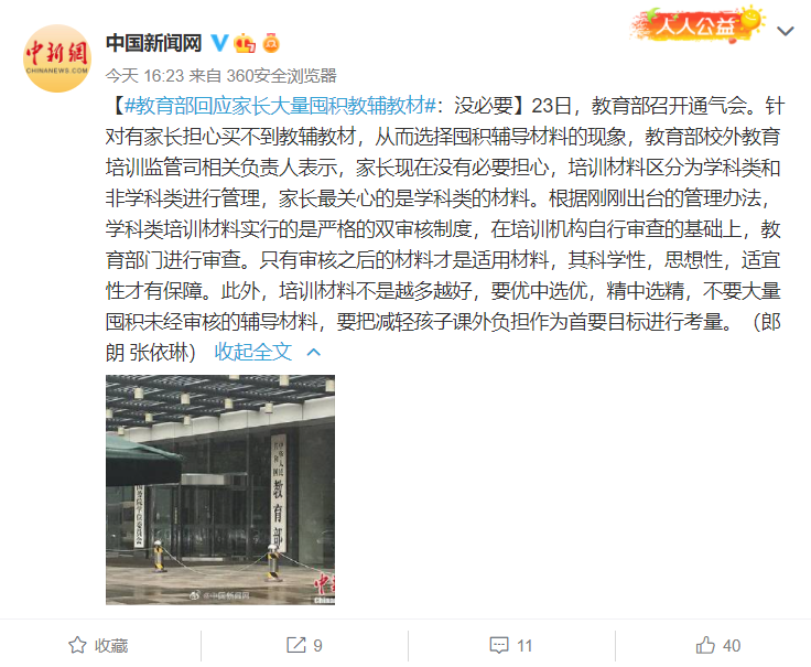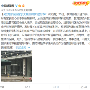 23日,教育部召开通气会。针对有家长担心买不到教辅教材,从而选择囤积辅导材料的现象,教育部校外教育培训监管司相关负责人表示,家长现在没有必要担心,培训材料区分为学科类和非学科类进行管理,家长最关心的是学科类的材料。根据刚刚出台的管理办法,学科类培训材料实行的是严格的双审核制度,在培训机构自行审查的基础上,教育部门进行审查。只有审核之后的材料才是适用材料,其科学性,思想性,适宜性才有保障。此外,培训材料不是越多越好,要优中选优,精中选精,不要大量囤积未经审核的辅导材料,要把减轻孩子课外负担作为首要目标进行考量。(郎朗 张依琳)