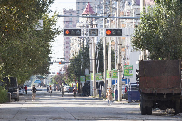 居民在黑龙江省哈尔滨市巴彦县一街道上行走,巴彦县对部分地区实行交通信号灯红灯管制。