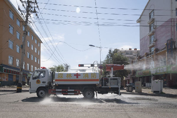 9月24日,哈尔滨市森林消防支队兴隆大队的消防员驾驶车辆对兴隆镇街道进行消杀。