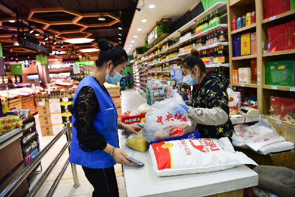 9月23日,在哈尔滨市巴彦县兴隆镇一超市,工作人员在为网上订货的居民挑选生活物资。