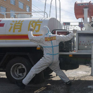 9月24日,在哈尔滨市巴彦县兴隆镇,哈尔滨市森林消防支队兴隆大队的消防员开启车上的消杀设备。