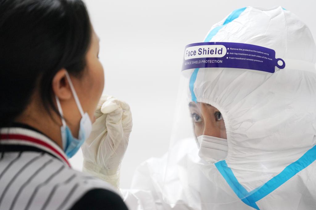 在哈尔滨市南岗区保健路街道松江新城社区核酸检测点,居民在进行核酸检测。新华社记者王建威 摄
