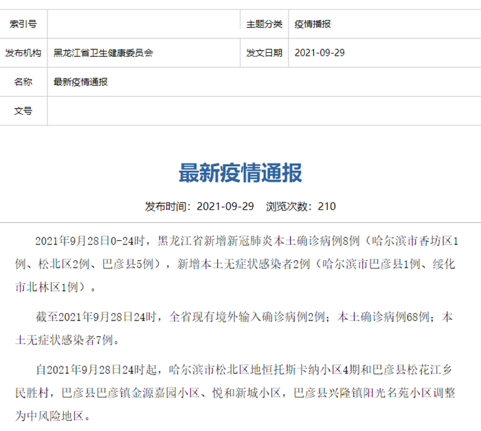 2021年9月28日0-24时,黑龙江省新增新冠肺炎本土确诊病例8例(哈尔滨市香坊区1例、松北区2例、巴彦县5例),新增本土无症状感染者2例(哈尔滨市巴彦县1例、绥化市北林区1例)。