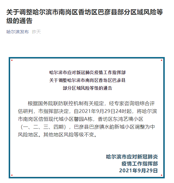 根据国务院联防联控机制有关规定,经专家咨询组综合评估研判,市指挥部决定,自2021年9月29日24时起,将哈尔滨市南岗区信恒现代城小区馨园A栋,香坊区东鸿艺境小区(一、二、三、四期),巴彦县巴彦镇水韵新城小区调整为中风险地区。其他地区风险等级不变。