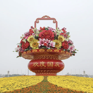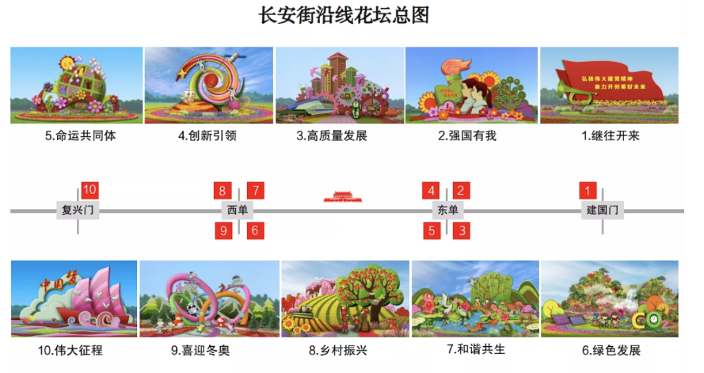 天安门广场花坛总设计师、北京城建园林设计院精品园艺工作室负责人、高级工程师蓝海浪介绍,天安门广场中心布置高18米的“祝福祖国”主题花坛,长安街沿线布置10组立体花坛。