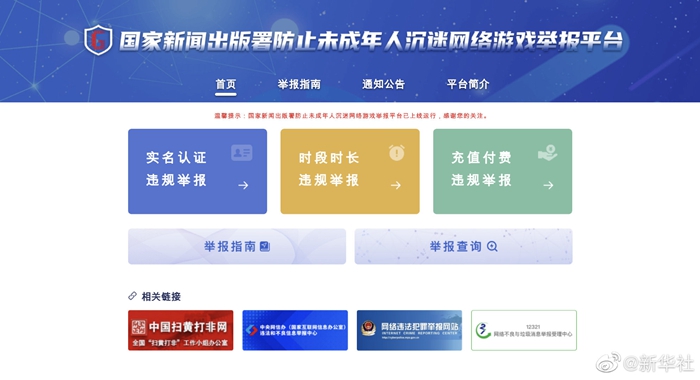 为督促游戏企业切实履行主体责任、严格执行防止未成年人沉迷网络游戏相关要求,发挥社会各方面监督作用,国家新闻出版署防止未成年人沉迷网络游戏举报平台9月30日正式上线运行。举报平台专项受理群众关于游戏企业防沉迷相关问题的举报,包括实名认证违规举报、时段时长违规举报、充值付费违规举报等,举报线索一经核实,有关部门将对违规游戏企业进行严厉查处。(记者史竞男)