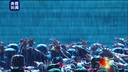 在灯光与雨水的交织中,鲜红的党旗从国家体育场的舞台圆心中缓缓升起,肃穆、温暖。百年风雨路,奋斗铸辉煌。雨中升起的党旗,升腾起所有人心中的感动与真情。