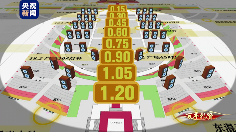 以广场最北侧的第一排音箱作为基线,音响团队按照从北往南的顺序,将每个观众方阵前的音箱发声设置为要比前一排音箱延时0.15秒后再发声。这就意味着最后一排音箱的发声比第一排音箱延时发声约1.2秒。这就保证了七一当天无论坐在哪个方阵的观众,当其他任意位置的音箱声音传到他所在方阵的时候,他面前的这排音箱也正好开始出声。保证了各个音箱之间不发生声音相互干扰,同时也让现场的每一位观众都能听到清晰饱满的声音。(记者 侯军 李文杰 刘洁 周培培 王瑞宁 曾文甫)