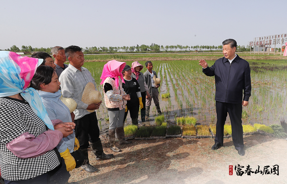 2020年6月9日,习近平总书记在宁夏回族自治区银川市贺兰县稻渔空间乡村生态观光园,同正在劳作的村民亲切交谈。