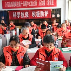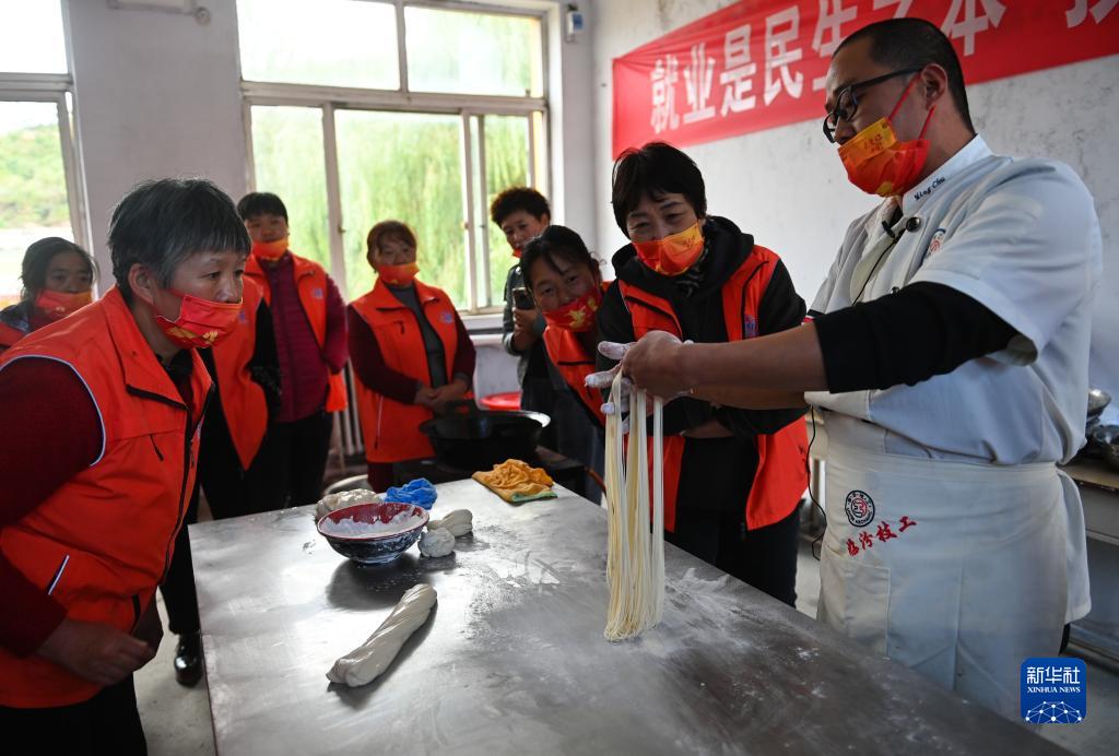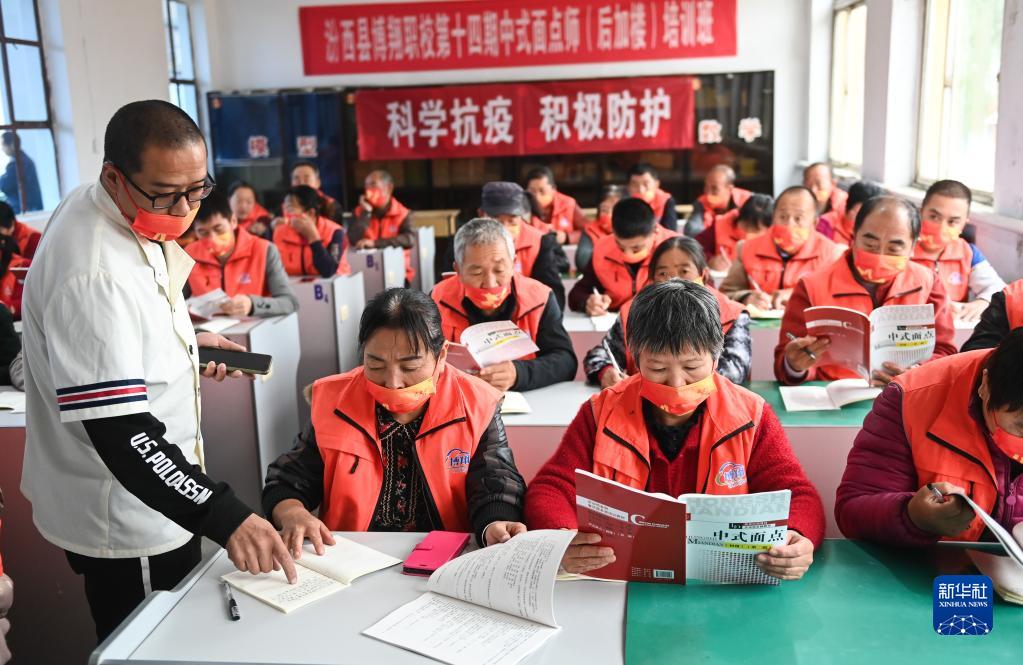 10月10日,在山西省汾西县永安镇后加楼村的安置点,老师给受灾群众讲解做面食的相关理论知识。新华社记者 柴婷 摄