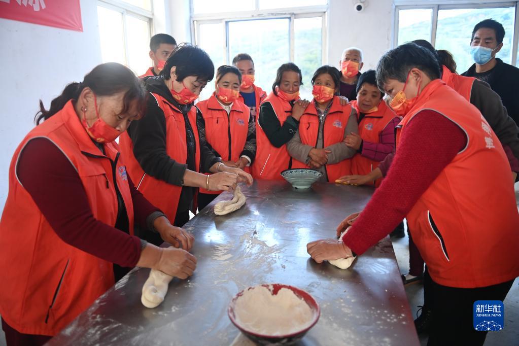10月10日,在山西省汾西县永安镇后加楼村的安置点,老师教受灾群众做拉面。新华社记者 柴婷 摄