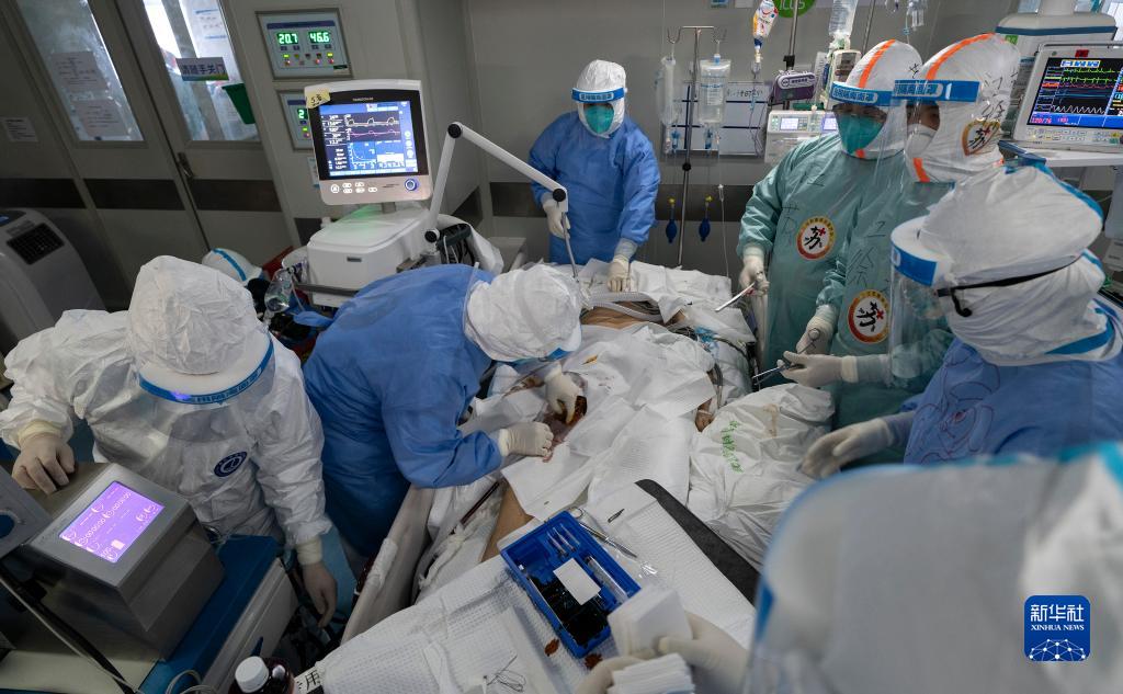 在武汉市肺科医院,医护人员对新冠肺炎危重症患者老胡进行体外膜肺氧合(ECMO)撤机操作(2020年4月5日摄)。新华社记者 费茂华 摄