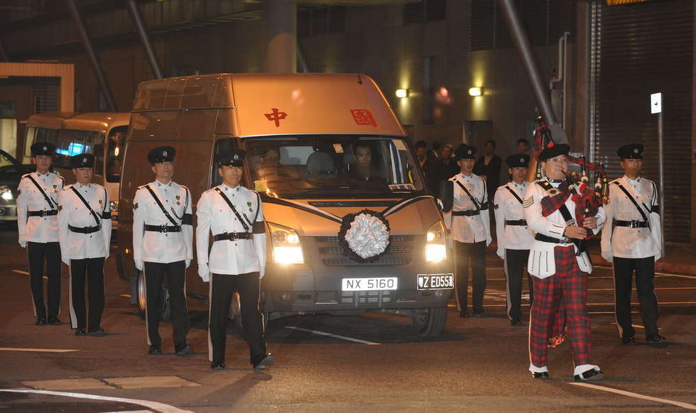 2010年4月18日晚,香港警员仪仗队在深圳湾口岸举行在青海玉树地震中为救人捐躯的香港义工黄福荣灵柩交接仪式。新华社记者 吕小炜 摄