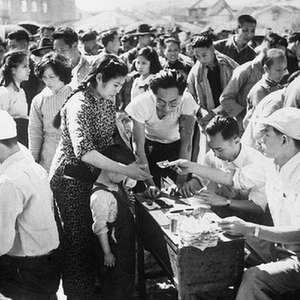 图为香港九龙城东头村受灾同胞领取救济金。新华社稿
