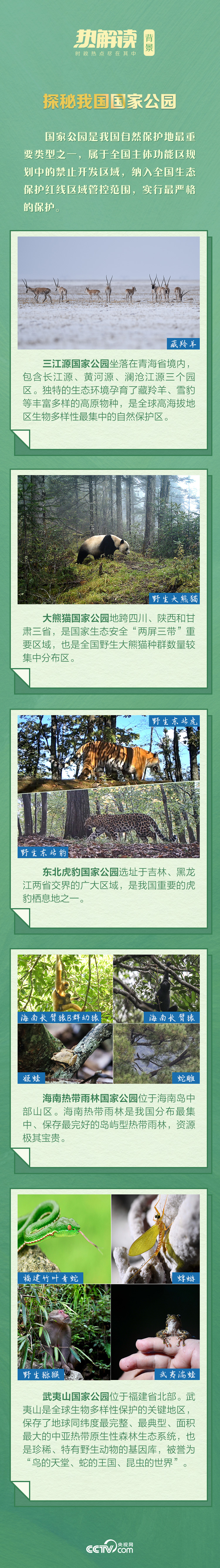 与此同时,习主席郑重宣布,中国正式设立三江源、大熊猫、东北虎豹、海南热带雨林、武夷山等第一批国家公园,同时启动北京、广州等国家植物园体系建设。