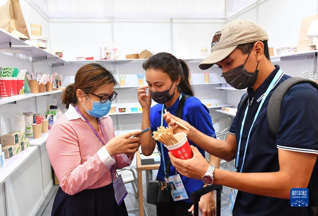 10月15日,两名来自哈萨克斯坦的采购商(右、中)在第130届广交会环保吸管展台洽谈。新华社记者 刘大伟 摄