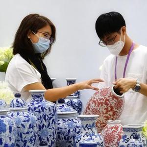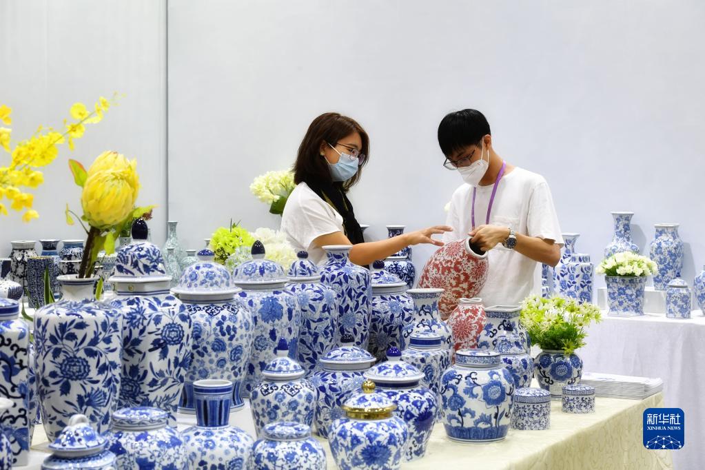 10月15日,一名国内采购商(左)在第130届广交会瓷器展台洽谈。新华社记者 刘大伟 摄