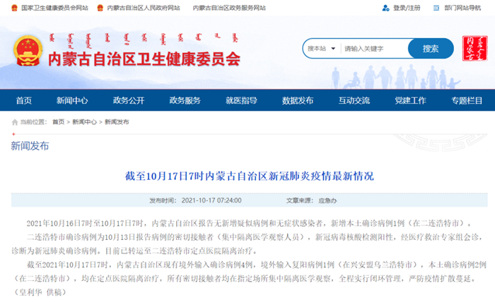 2021年10月16日7时至10月17日7时,内蒙古自治区报告无新增疑似病例和无症状感染者,新增本土确诊病例1例(在二连浩特市)。
