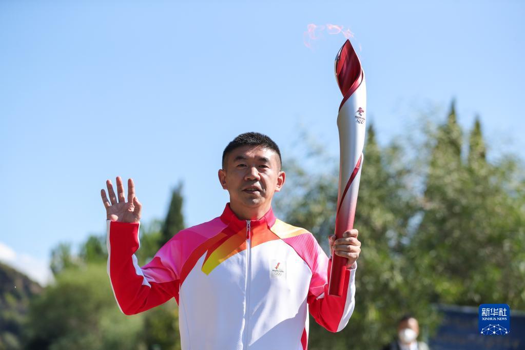 10月18日,第二名火炬手——前中国短道速滑运动员李佳军手持北京冬奥会火炬“飞扬”在火种采集成功后传递。新华社记者 郑焕松 摄