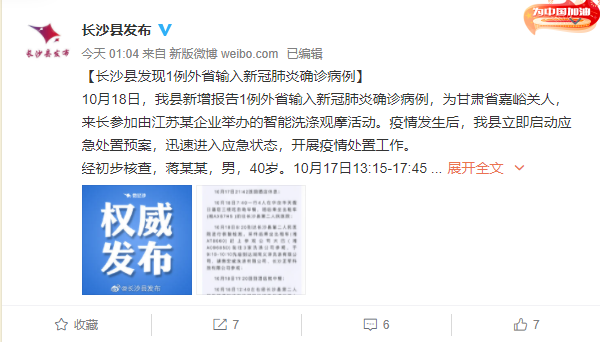 10月18日,我县(湖南省长沙市长沙县)新增报告1例外省输入新冠肺炎确诊病例,为甘肃省嘉峪关人,来长参加由江苏某企业举办的智能洗涤观摩活动。疫情发生后,我县立即启动应急处置预案,迅速进入应急状态,开展疫情处置工作。