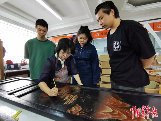 胡昕(左二)教授学生金漆镶嵌技艺。陈鼎/摄