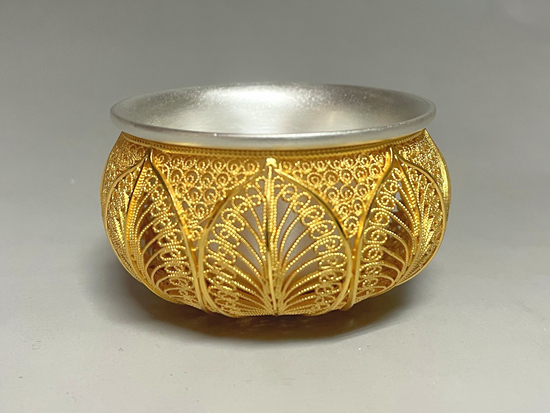 如果用如此细的金属丝制作花丝尚可通过勤练习得,那么将已经掐出形状的不同种类的花丝焊接成各式纹样图案,最终拼接组合成一件精巧的摆件器物,便无疑可称之为“绝技”了。董瑞京用焊枪对着案台上的一缕花丝点着了火,仅仅不到5秒的时间,那缕花丝便化作了“银珠”,“做了这么多年的花丝,最难的就是这个。焊接时的火候掌握不好,花丝就会化,因为它太细了。如果是做一个碗或是一个盘子,一旦焊化,也就前功尽弃了。”董瑞京说,想掌握“绝技”就要沉得下心,静得住气,想要做出好作品,需要心细、手细。