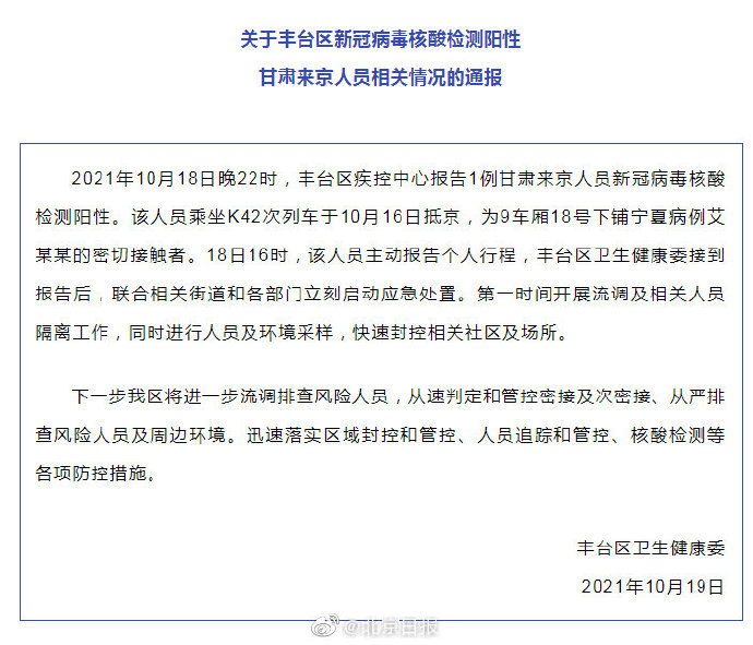 2021年10月18日晚22时,丰台区疾控中心报告1例甘肃来京人员新冠病毒核酸检测阳性。该人员乘坐K42次列车于10月16日抵京,为9车厢18号下铺宁夏病例艾某某的密切接触者。18日16时,该人员主动报告个人行程,丰台区卫生健康委接到报告后,联合相关街道和各部门立刻启动应急处置。第一时间开展流调及相关人员隔离工作,同时进行人员及环境采样,快速封控相关社区及场所。