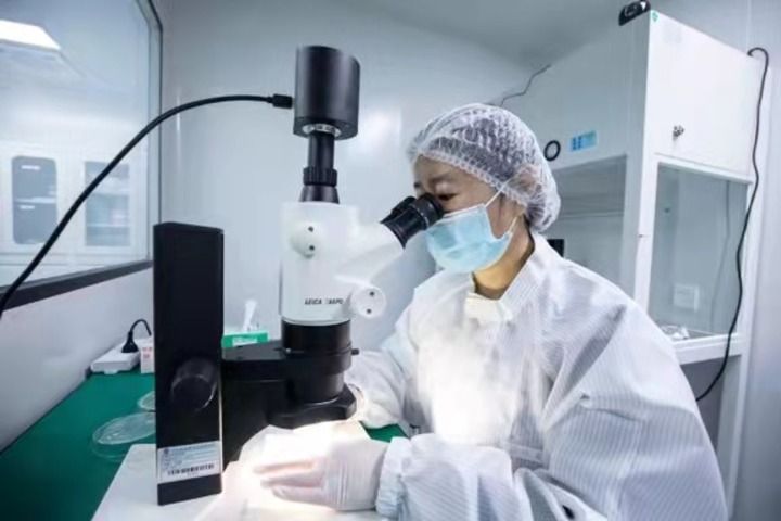 2021年7月12日中科院地质与地球物理所的实验人员在显微镜下对月壤中的微米级颗粒进行分类。(任晖摄 受访单位供图)