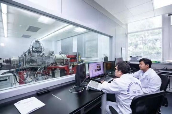 2021年7月15日中科院地质与地球物理所的科研人员在对月球玄武岩开展年龄测试。(任晖摄 受访单位供图)
