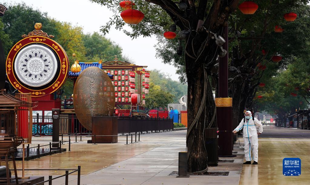 10月19日,工作人员在西安市大唐不夜城步行街进行消杀作业。新华社记者 刘潇 摄